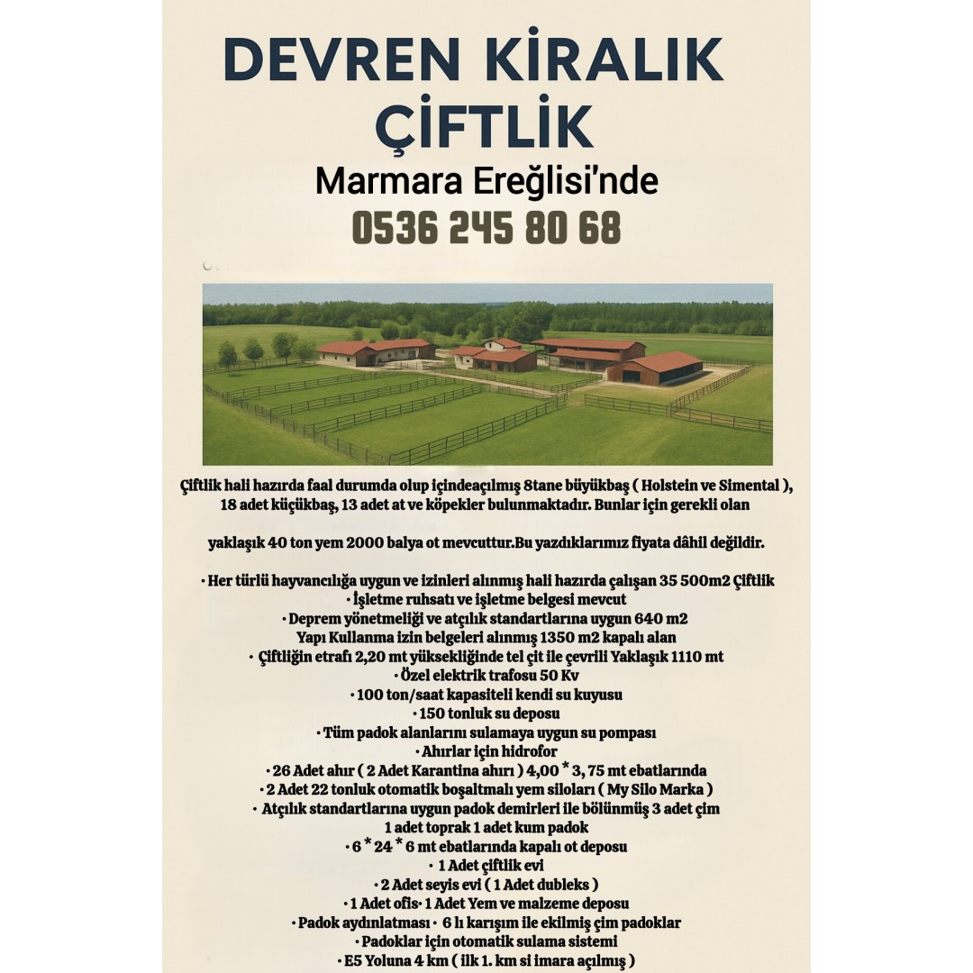 Çiftlik hali hazırda faal durumda olup içinde 8 tane büyükbaş ( Holstein ve Simental ), 18 adet küçükbaş, 13 adet at ve köpekler bulunmaktadır. Bunlar için gerekli olan yaklaşık 40 ton yem 2000 balya ot mevcuttur. Bu yazdıklarımız fiyata dâhil değildir.
